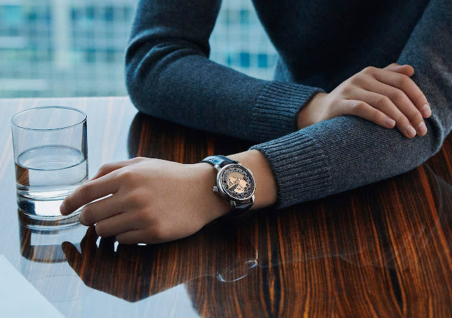 Mặt số tinh thể sapphire phía trên hiển thị đường cắt phủ vàng hồng thể hiện các lục địa khi nhìn từ Bắc Cực. Chúng được bao quanh bởi tên của 24 thành phố đại diện cho các múi giờ khác nhau.