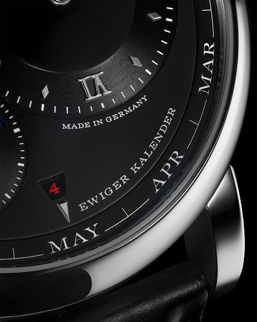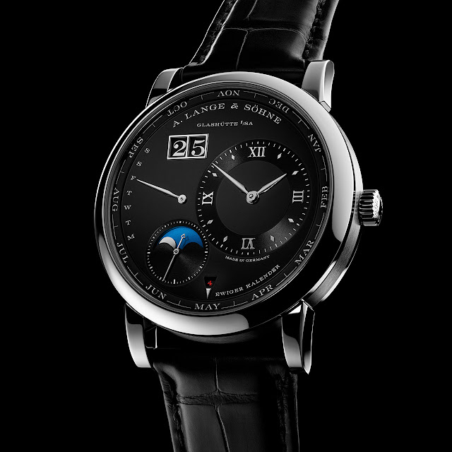 Một sản phẩm độc quyền của các cửa hàng A. Lange & Söhne, Lịch vạn niên Lange 1 bằng bạch kim, tham chiếu. 345.036E, được hoàn thiện bằng dây đeo bằng da cá sấu màu đen khâu tay và được cố định bằng khóa có ngạnh bằng bạch kim 950.