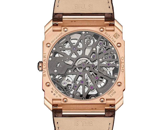 Kết hợp với dây đeo bằng da cá sấu màu nâu với khóa chốt bằng vàng và khả năng chống nước ở độ sâu 30 mét / 100 feet, Bulgari Octo Finissimo Skeleton 8 Days mã mới. 103667 có giá 36.200 CHF.