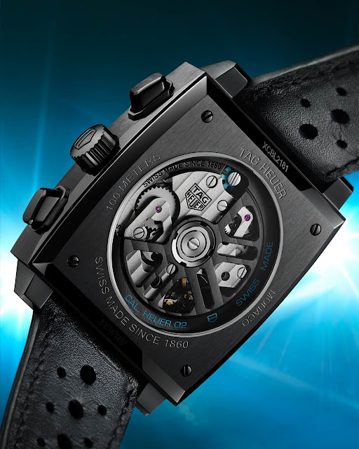 Bộ máy Calibre Heuer 02 được sản xuất nội bộ có thể được nhìn thấy qua mặt sau vỏ sapphire và có khối dao động tùy chỉnh, bánh xe cột và các bản khắc với các chi tiết màu xanh lam.