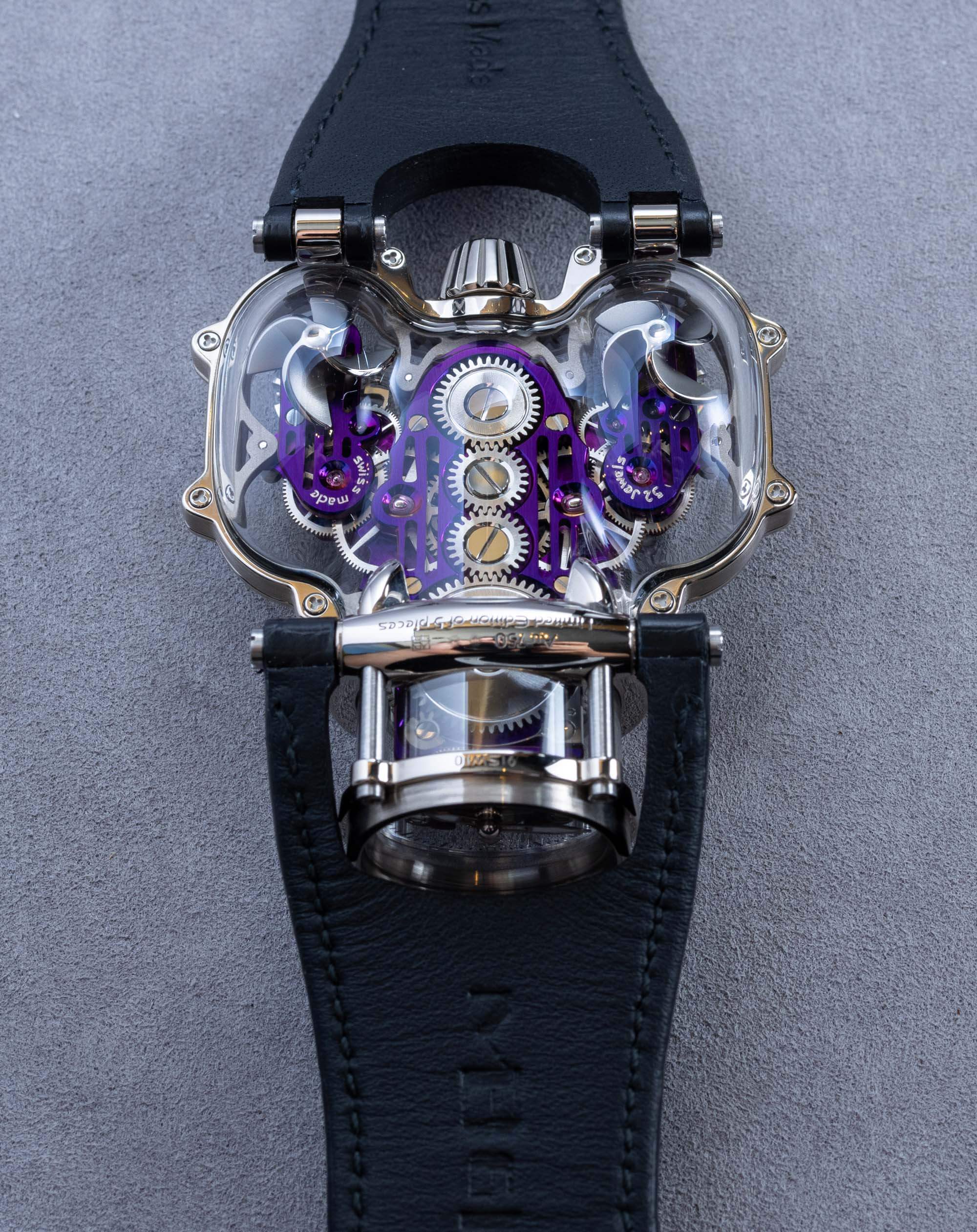 Bộ chuyển động được tạo thành từ 301 bộ phận, được thiết kế đối xứng nhất có thể và có các cầu bánh xe cân bằng nâng lên đặc biệt của MB & F hiện nay. Mỗi bánh xe cân bằng kép hoạt động ở tần số 2,5Hz (18.000 bph) và bộ chuyển động có khả năng dự trữ năng lượng trong 45 giờ. Tôi nghĩ rằng một chỉ báo dự trữ năng lượng ở đâu đó trên bộ máy sẽ là một ý tưởng hay – và đây chính xác là thứ đã tìm ra cách trong một số đồng hồ MB&F lên dây thủ công khác.