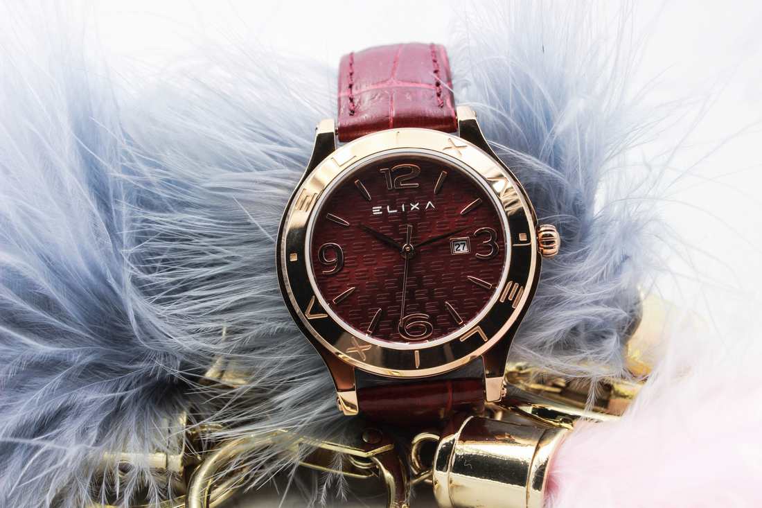 Vỏ đồng hồ được mạ vàng sang trọng, ẩn trong đó là dòng chữ Elixa nhẹ nhàng tinh tế như lớp vỏ kẹo bạc hà thanh mát. Thì ở bên trong vỏ kẹo đó, lại là vị dâu ngọt ngào.