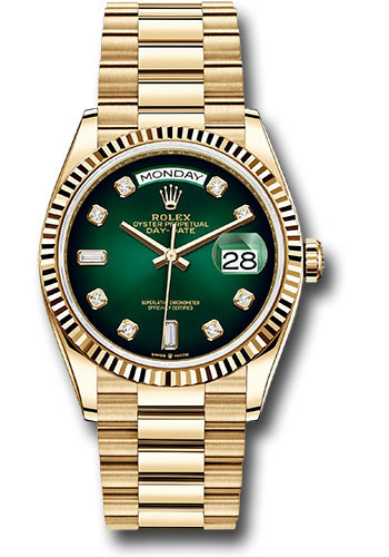 36mm 18K yellow gold case, screw-down back, screw-down crown with twinlock double waterproofness system, fluted bezel, scratch-resistant sapphire crystal with cyclops lens over the date, green ombre´ dial, diamond hour markers, Rolex calibre 3255 perpetual self-winding movement with centre hour, minute and seconds hands, instantaneous day and date in apertures, unrestricted rapid-setting, and stop-seconds for precise time setting, approximately 70 hours of power reserve, 18K yellow gold President bracelet with semi-circular three-piece links, concealed folding Crownclasp buckle. Waterproof to 100 meters.