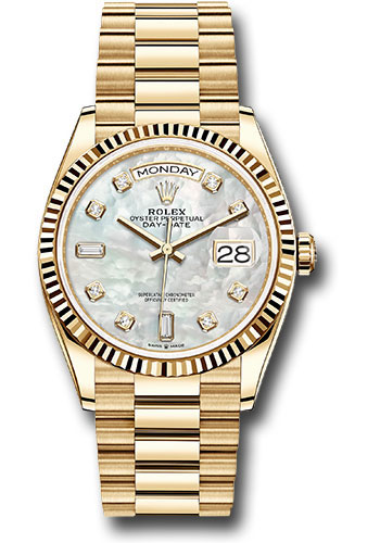 36mm 18K yellow gold case, screw-down back, screw-down crown with twinlock double waterproofness system, fluted bezel, scratch-resistant sapphire crystal with cyclops lens over the date, mother-of-pearl dial, diamond hour markers, Rolex calibre 3255 perpetual self-winding movement with centre hour, minute and seconds hands, instantaneous day and date in apertures, unrestricted rapid-setting, and stop-seconds for precise time setting, approximately 70 hours of power reserve, 18K yellow gold President bracelet with semi-circular three-piece links, concealed folding Crownclasp buckle. Waterproof to 100 meters.