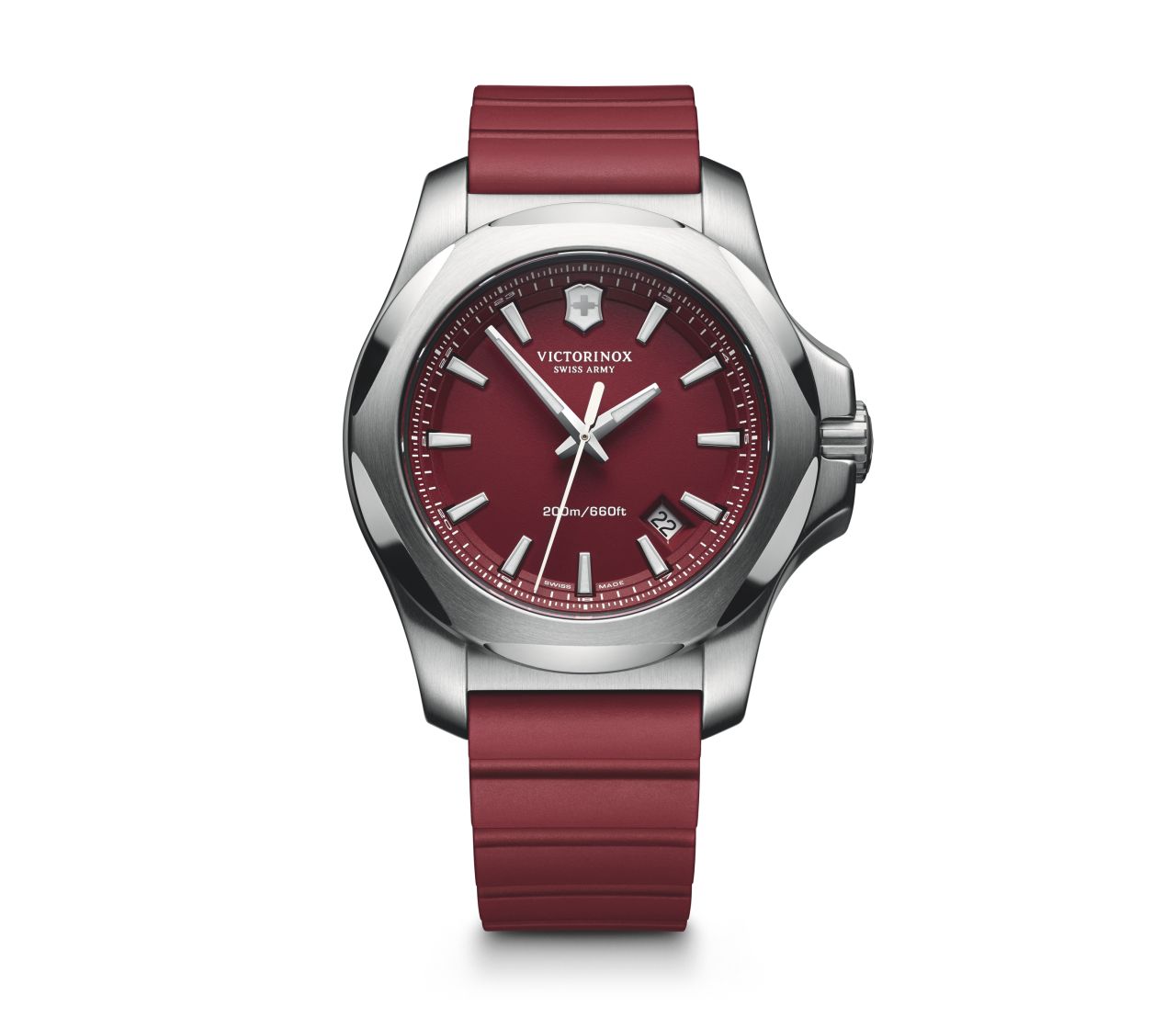Đồng hồ Victorinox 241719.1 thể hiện quyết tâm mạnh mẽ và lòng dũng cảm bởi màu đỏ bao trùm cả sản phẩm từ dây đeo cao su đến “mặt tiền” đồng hồ. Dây cao su hoàn toàn giúp ích trong việc chống thấm nước ở độ sâu 200m của đồng hồ cũng như bảo đảm cho việc hoạt động và độ nặng của sản phẩm được giảm bớt.